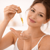 Frau trägt Cacay ÉLIXIR auf – pflegendes Gesichtsöl für Glow & Regeneration mit pflanzlichem Retinol.